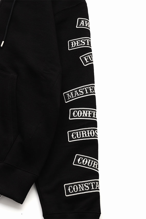 Regular fit zip-up hoodie made by original french terry fabric blends luxurious Suvin Gold and Giza cotton with advanced odor-neutralizing fibers that effectively combat unpleasant smells like ammonia. Embroidered patch randomly patched on both sleeves and the hood.