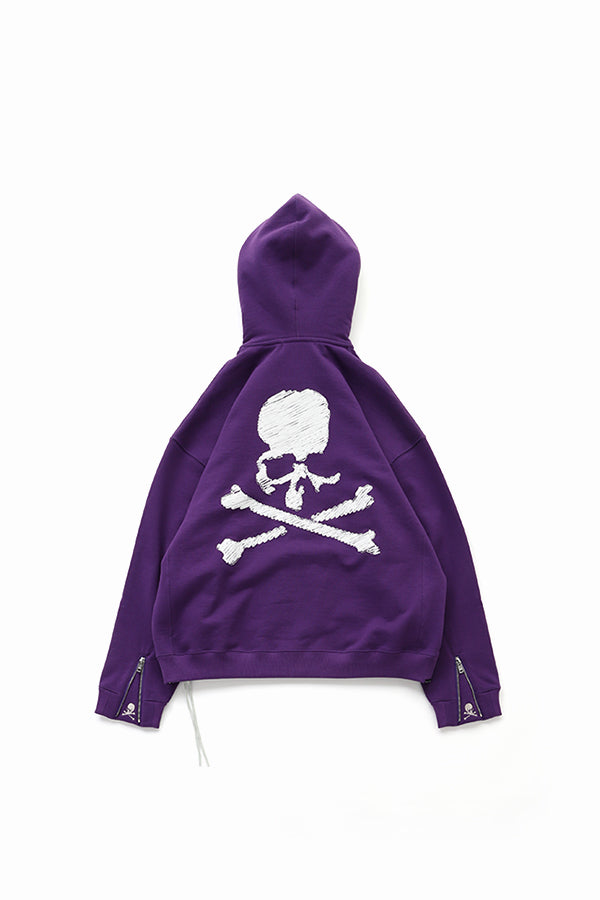 Boxy fit zip-up hoodie made by original french terry fabric blends luxurious Suvin Gold and Giza cotton with advanced odor-neutralizing fibers that effectively combat unpleasant smells like ammonia. Puff print LOGO on the hood, SKULL on the back.