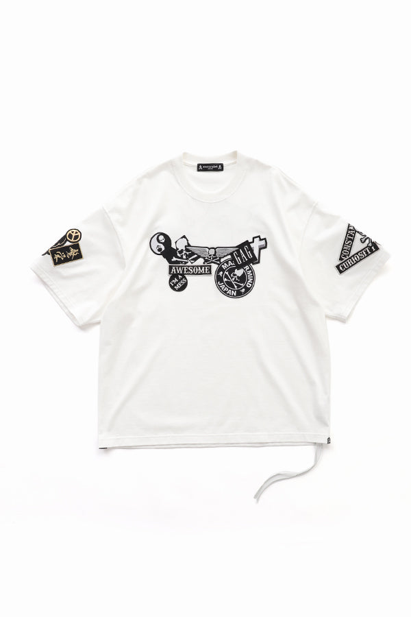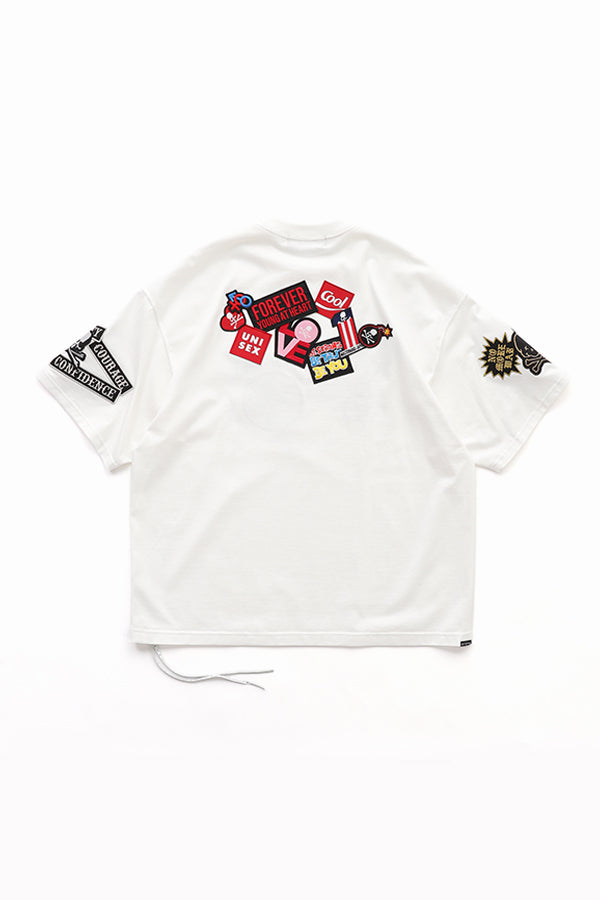 Boxy fit short sleeve Tee made by original jersey knit fabric blends luxurious Suvin Gold and Giza cotton with advanced odor-neutralizing fibers that effectively combat unpleasant smells like ammonia. The yarn is spun using MVS technology, providing enhanced shape retention. Embroidery patches randomly patched on the body.