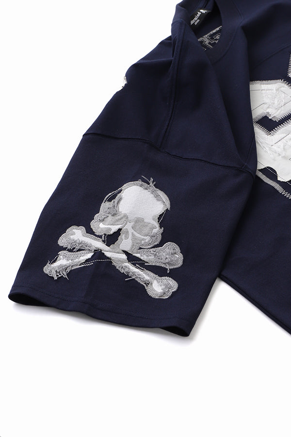 Boxy fit short sleeve Tee made by original jersey knit fabric blends luxurious Suvin Gold and Giza cotton with advanced odor-neutralizing fibers that effectively combat unpleasant smells like ammonia. The yarn is spun using MVS technology, providing enhanced shape retention. Distressed patch #69 on both front and back, SKULL on both sleeves, and LOGO on the back yoke.