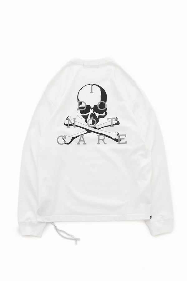 Regular Fit Long Sleeve T-Shirt made by our own-made "Suvin Gold × Giza hybrid cotton" alongside deodorant yarn which removes only bad odors that human feels uncomfortable. (ex. ammonia, acetic acid and hydrogen sulfide) Using special apparatus which polish the fabric like a diamond for the softer feels. Printed LOGO on the Front, SKULL on the Back. Convex Print "I DO NOT CARE" on the SKULL.