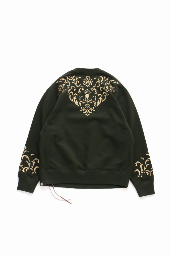Regular Fit Crewneck Sweatshirt made by our own-made "Suvin Gold × Giza hybrid cotton" alongside deodorant yarn which removes only bad odors that human feels uncomfortable. (ex. ammonia, acetic acid and hydrogen sulfide) Using special apparatus which polish the fabric like a diamond for the softer feels. (THICKER) Original Ornament Pattern Embroidered.