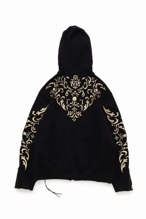 Regular Fit Zip-Up Hoodie made by our own-made "Suvin Gold × Giza hybrid cotton" alongside deodorant yarn which removes only bad odors that human feels uncomfortable. (ex. ammonia, acetic acid and hydrogen sulfide) Using special apparatus which polish the fabric like a diamond for the softer feels. (THICKER) Original Ornament Pattern Embroidered.