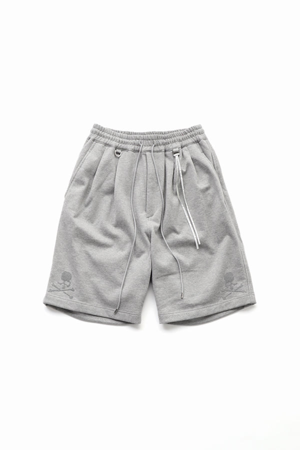Loose fit shorts made by original french terry fabric blends luxurious Suvin Gold and Giza cotton with advanced odor-neutralizing fibers that effectively combat unpleasant smells like ammonia. Glass bead printed SKULL on the both front side hem.