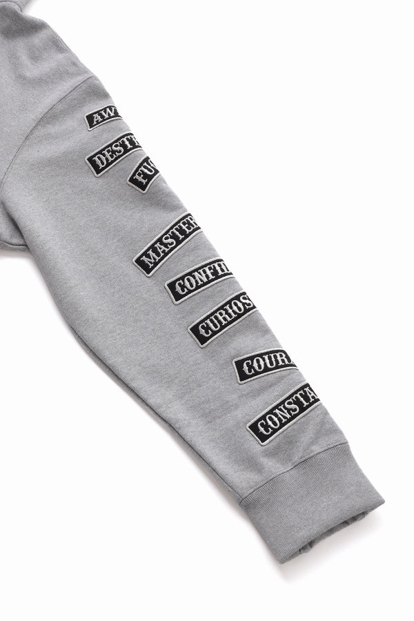 Regular fit zip-up hoodie made by original french terry fabric blends luxurious Suvin Gold and Giza cotton with advanced odor-neutralizing fibers that effectively combat unpleasant smells like ammonia. Embroidered patch randomly patched on both sleeves and the hood.