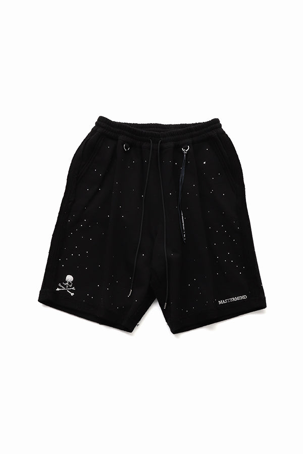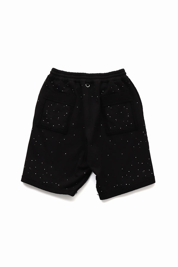 Regular fit shorts with cut-off details made by original french terry fabric blends luxurious Suvin Gold and Giza cotton with advanced odor-neutralizing fibers that effectively combat unpleasant smells like ammonia. Swarovski🄬 Crystals SKULL on the right front hem, LOGO on the left front hem, and randomely scattered.